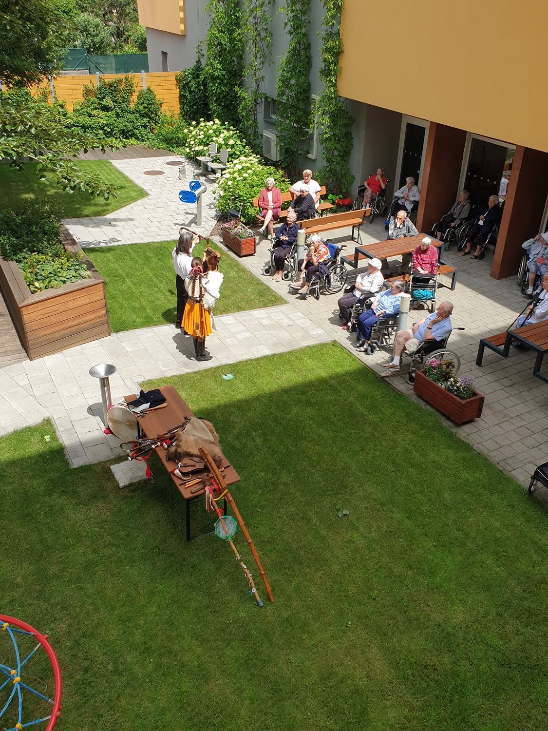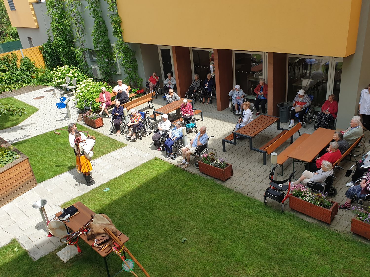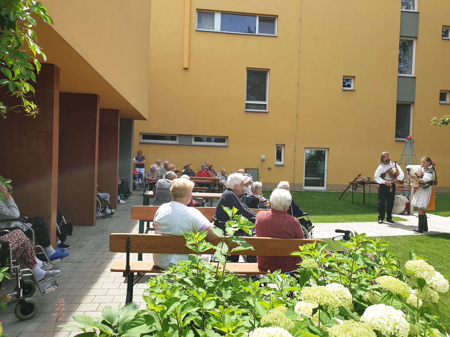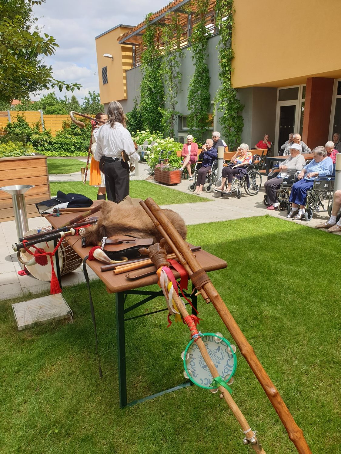 V naší Mezigenerační zahradě se rozezněly tradiční lidové nástroje - u nás však poprvé. Klienti mají příležitost seznámit se s manželským párem Lucií a Ondřejem Tryhukovými, kteří nám dnes zpřístupní tóny dudácké muziky a představí kus historie. Děkujeme Vám za krásný a pestrý zážitek.