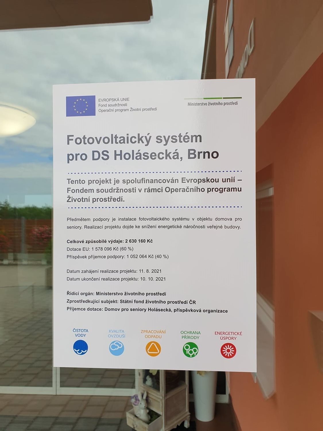 V měsíci červenci jsme zahájili instalaci fotovoltaické elektrárny na střeše našeho domova. Projekt je spolufinancován Evropskou unií - fondem soudržnosti v rámci Operačního programu Životního prostředí.
