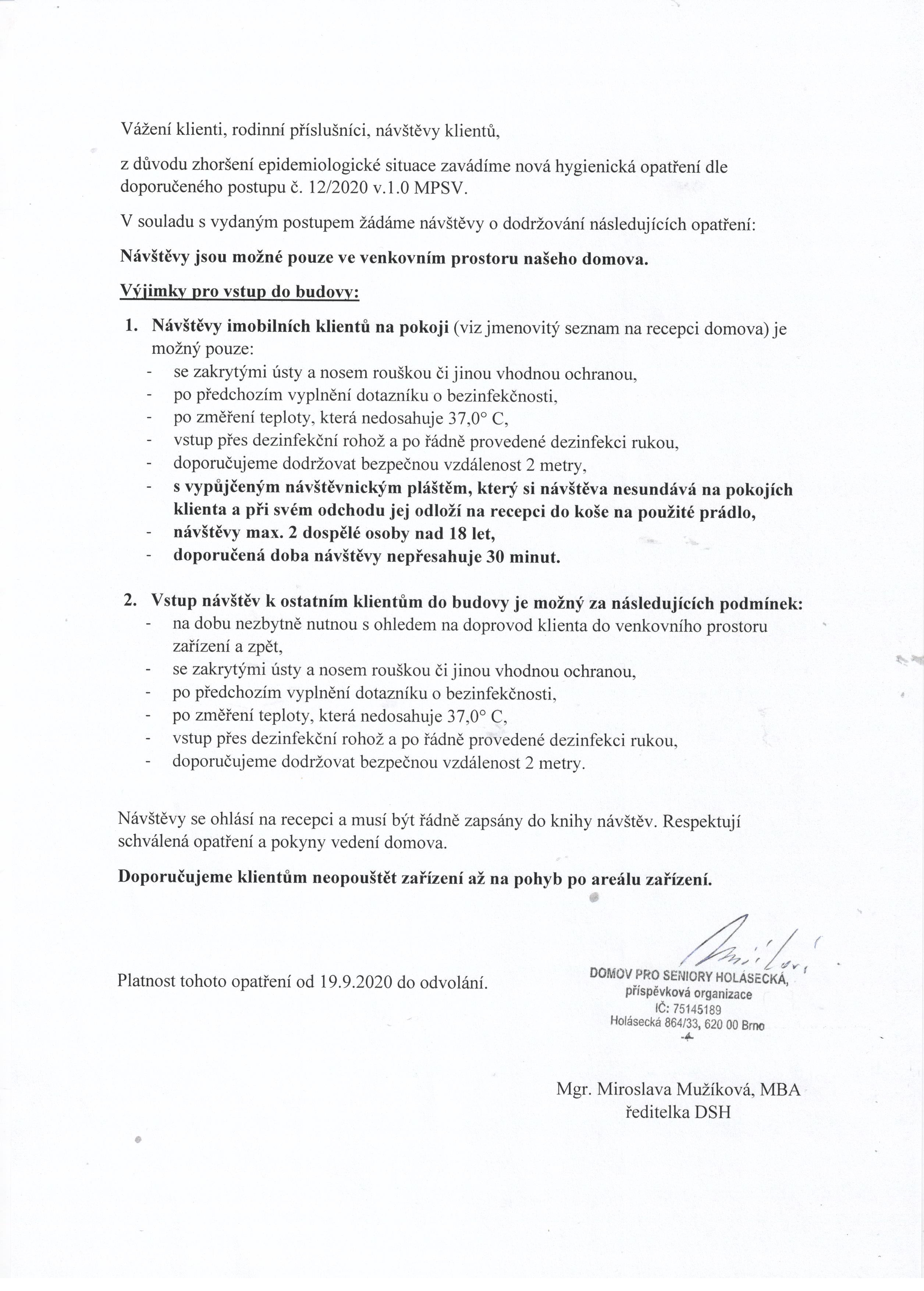 z důvodu zhoršení epidemiologické situace zavádíme nová hygienická opatření dle doporučeného postupu č. 12/2020 v.1.0 MPSV.