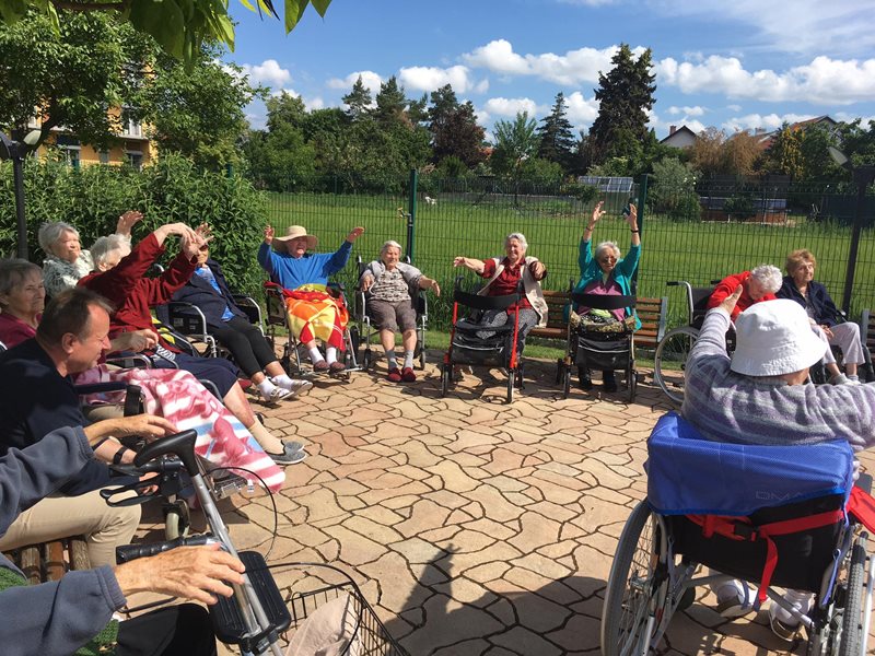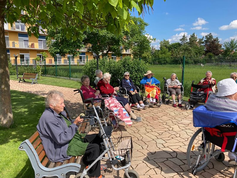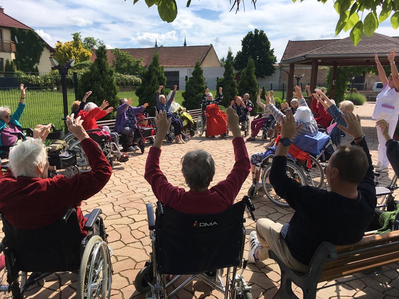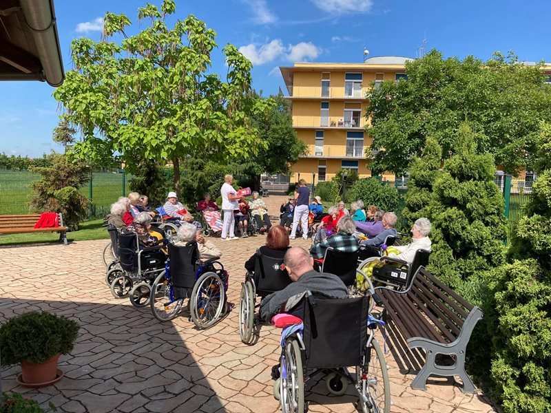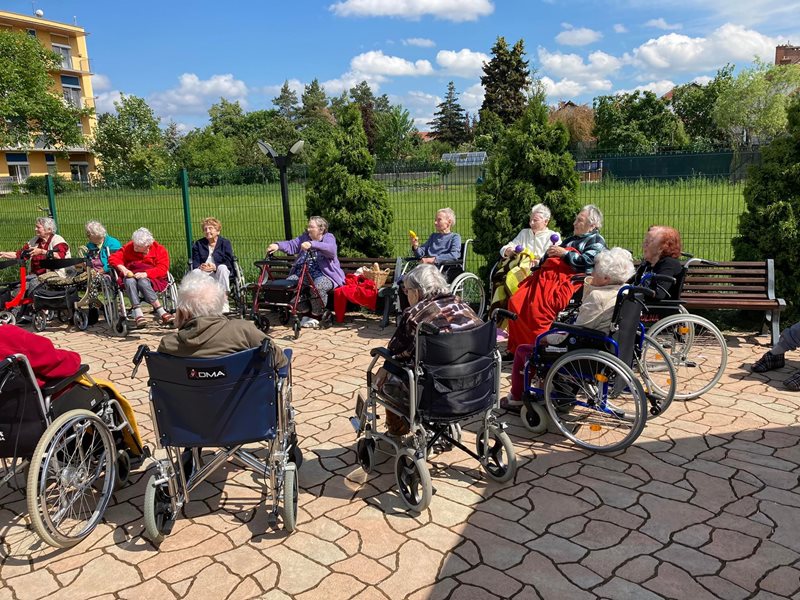 Úterní dopoledne se neslo v duchu zpěvu a hry na hudební nástroje. Klienti si užívali hezkého počasí, zpívali a soustředili se na rytmus - s doprovodem a pomocí aktivizačních pracovnic.