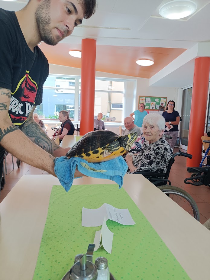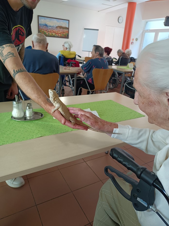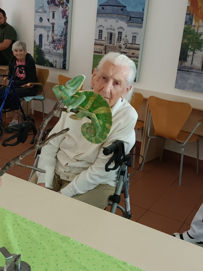 Návštěva Daniela Filípka a jeho exotických zvířátek byla pro naše klienty úžasným zpestřením. Nepřijel totiž sám – přivezl si sebou rozmanité druhy zvířat, která si klienti mohli nejen prohlédnout, ale na většinu z nich si během programu také sáhnout. Součástí návštěvy byla i ukázka krmení a celý program byl doprovázen poutavým a odborným výkladem.