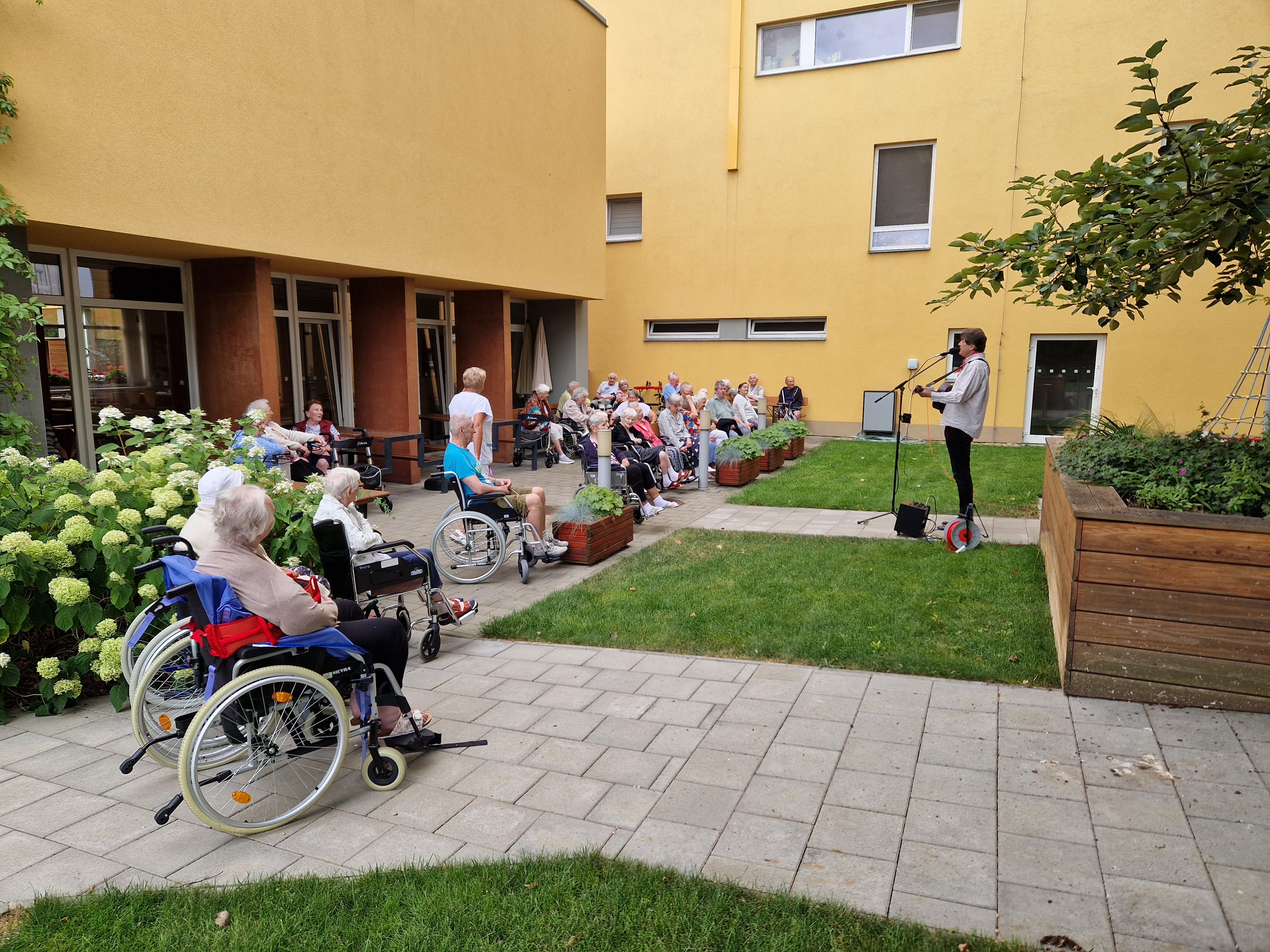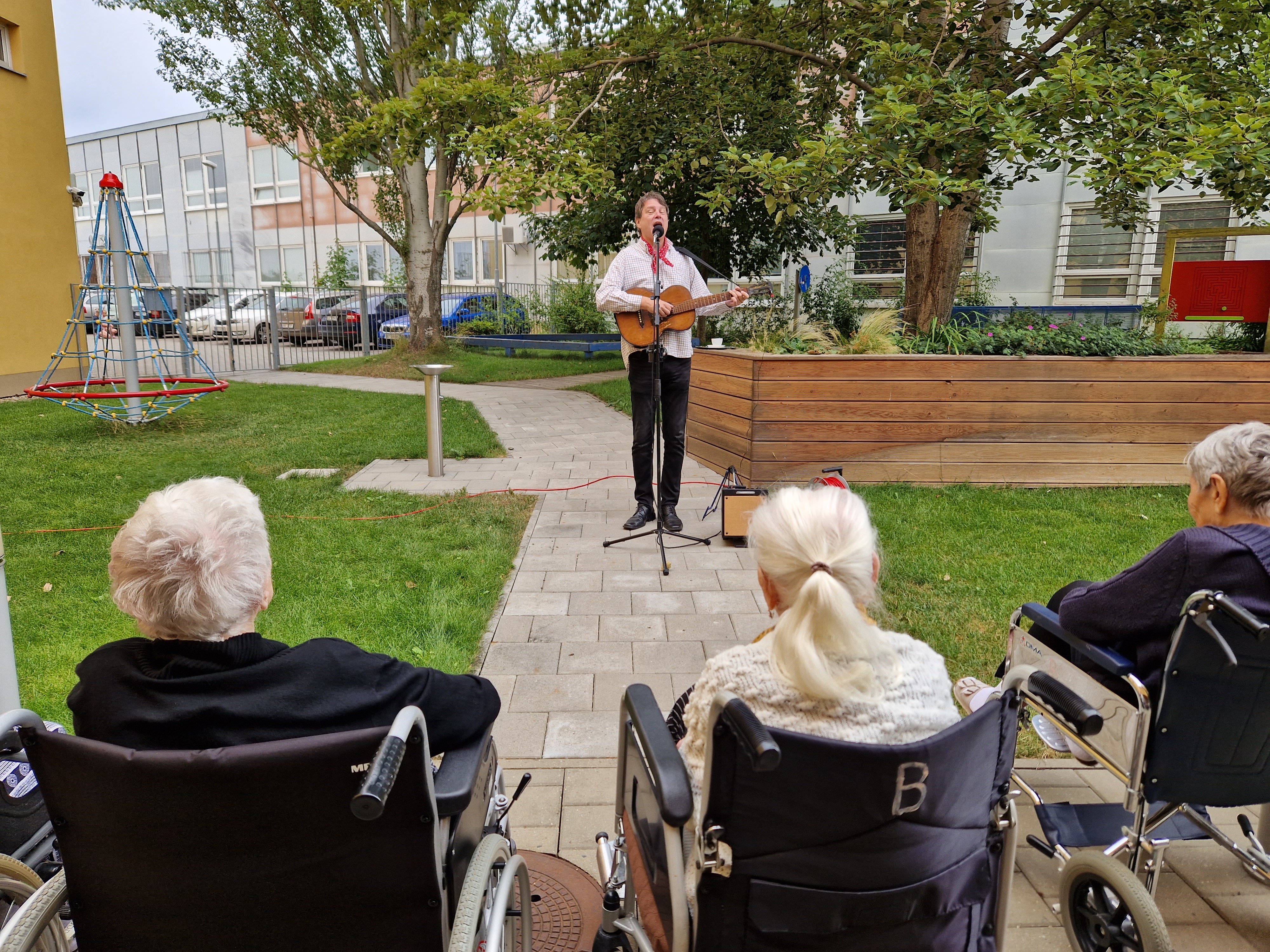 Krásně se ochladilo a my si mohli užít koncert pana Pecháčka ze skupiny Šlapeto. Vystupoval se svými pohodovými písněmi v naší mezigenerační zahradě. Jeho písničky vždy navodí hezkou atmosféru. Děkujeme a budeme se těšit zase příště.