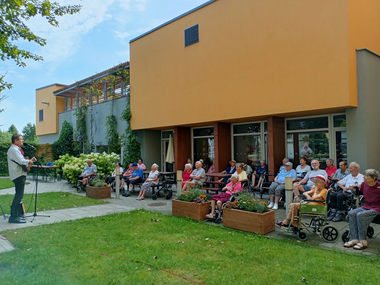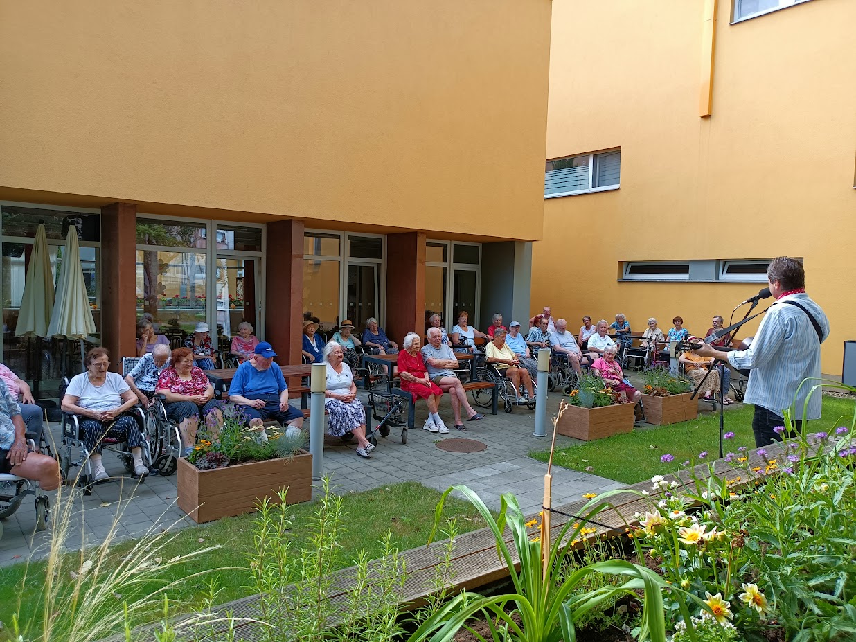 Nový týden jsme začali z vesela. V Mezigenerační zahradě nám v pondělí 15.července za doprovodu kytary zazpíval známé staropražské písničky a šlágry zpěvák Vladimír Pecháček z legendární skupiny Patrola Šlapeto. Naši klienti si společně s ním zazpívali a zpříjemnili si tak teplý letní den. Děkujeme