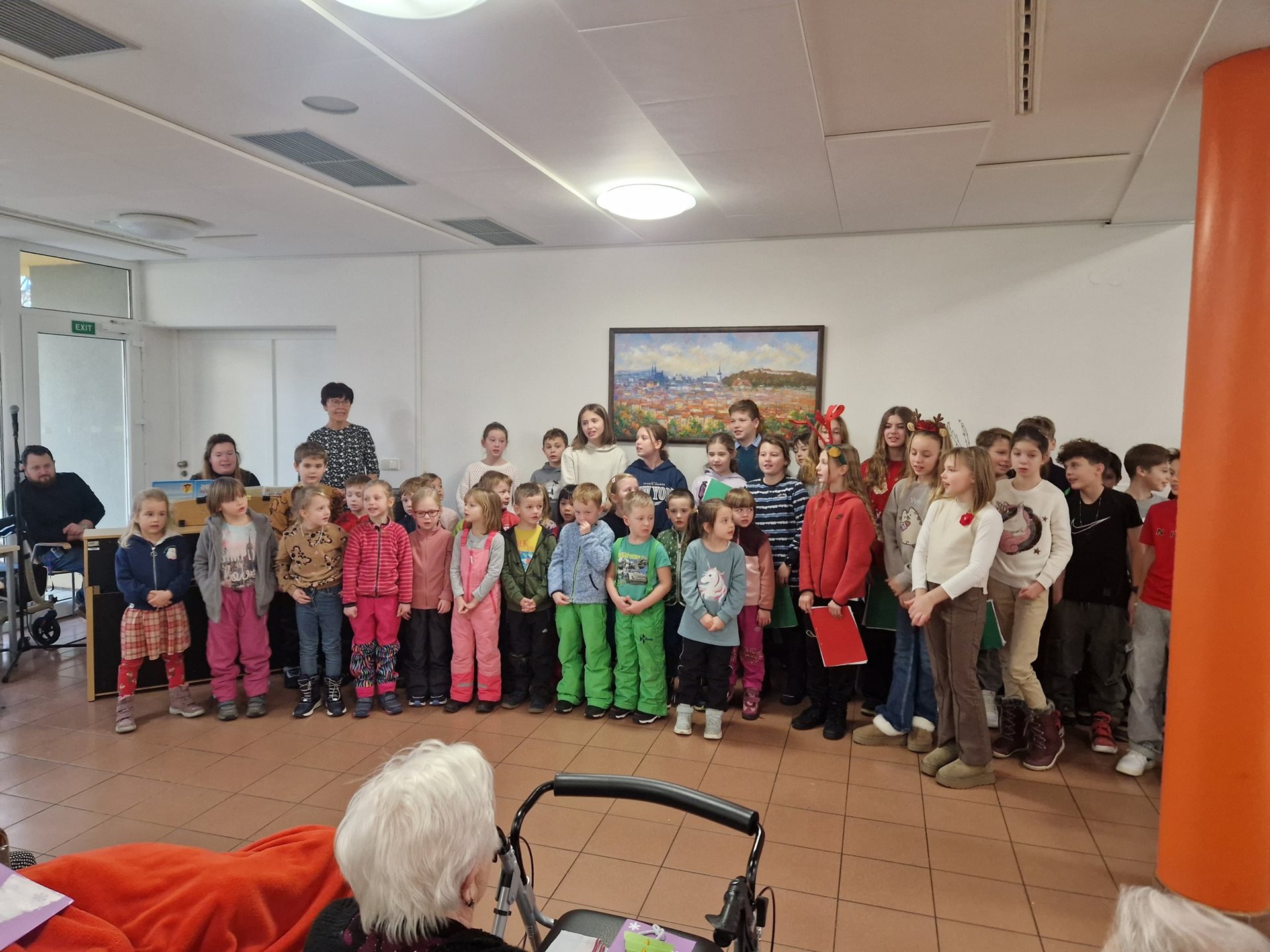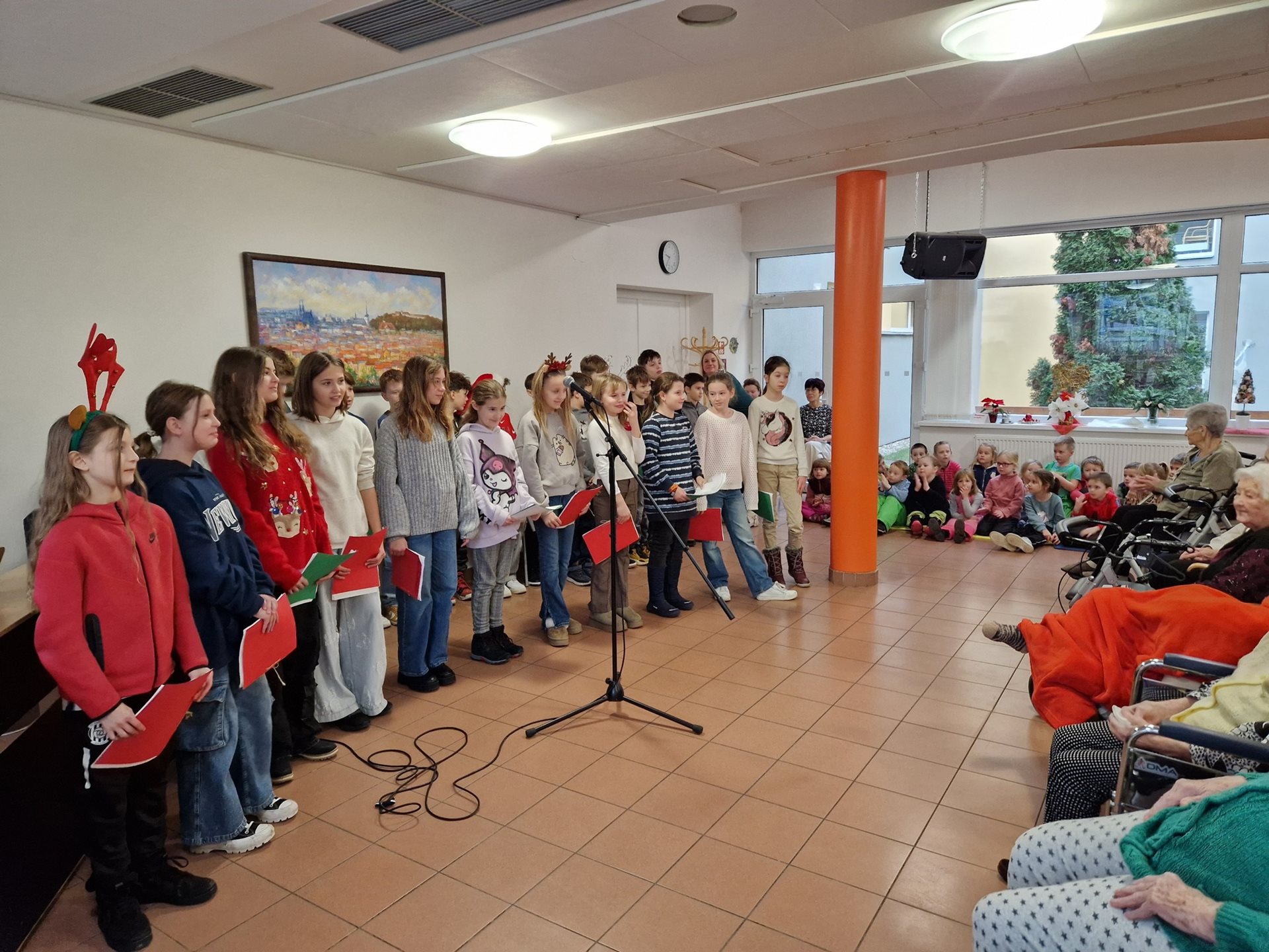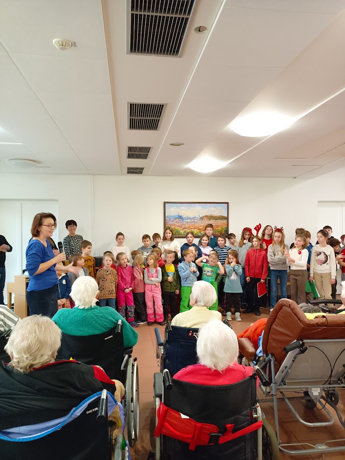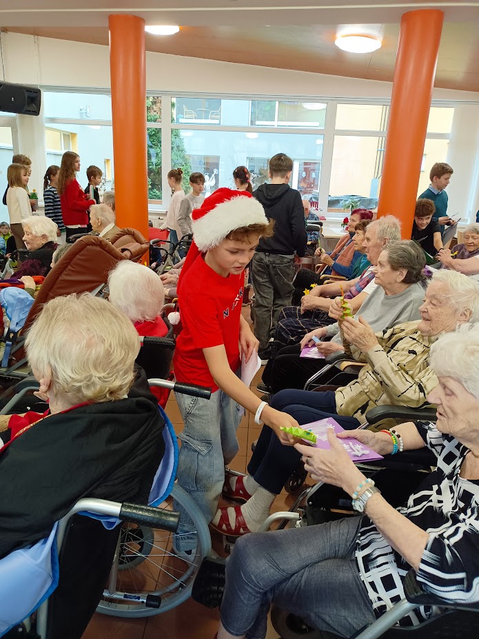 V pondělí 9.12.2024 naši klienti měli krásný zážitek – žáci 5. ročníku ZŠ Bakalovo nábřeží a děti ze sousední mateřské školy Holásecká vystoupili s pásmem vánočních písní. Vládla sváteční nálada, děti byly nadšené a svou energií obdarovaly naše klienty. Na závěr si společně zazpívaly několik koled a děti také klienty potěšily vyrobenými vánočními přáníčky